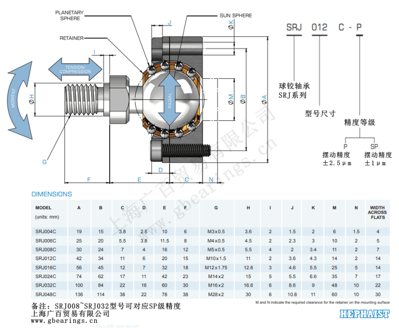 SRJ008C-SP 日本HEPHAIST球鉸軸承 用于自由度平臺